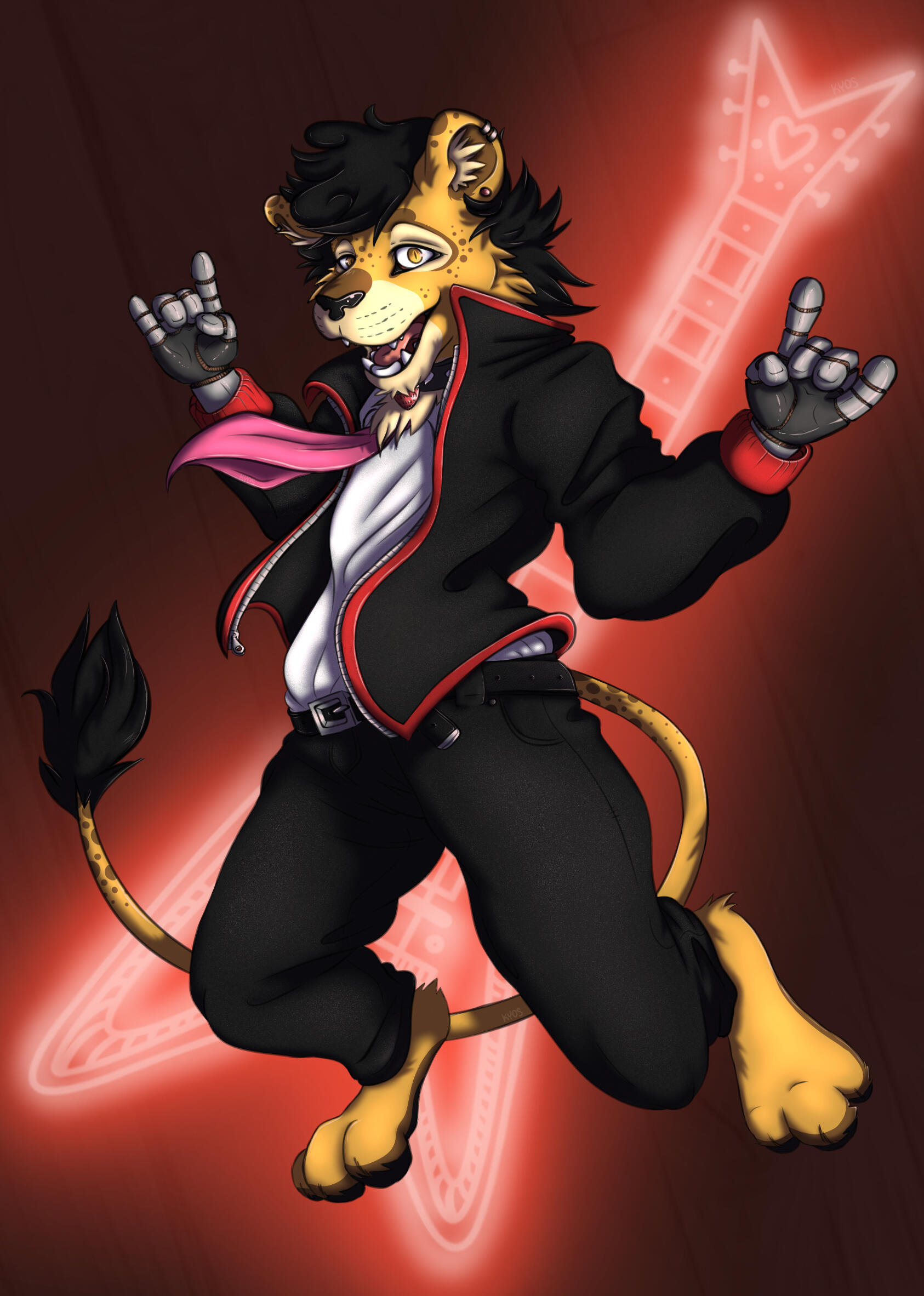 Prefers to keep to himself, unless around friends. Very dark humored, and comes off as rather sadistic when cracking jokes. He is often seen relaxing off away from people, but is not mean spirited. Hates idiots, regardless of being empty-minded himself most of the time. Has a habit of being cynical, and states facts as he sees them.His spots are actually dyed into his fur, and are sporatic. Has a habit of doodling and coloring all over himself.